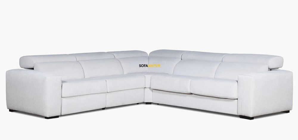 Sofá rinconera con cabezales abatibles, 2 asientos relax motor y brazo siesta arcón.