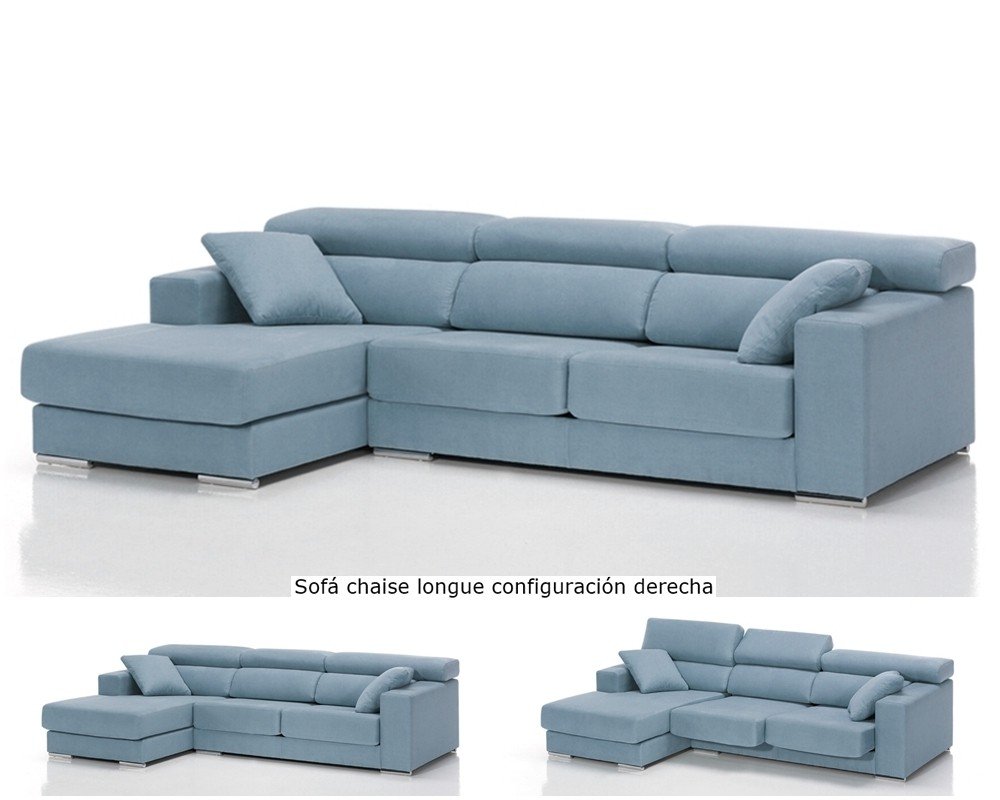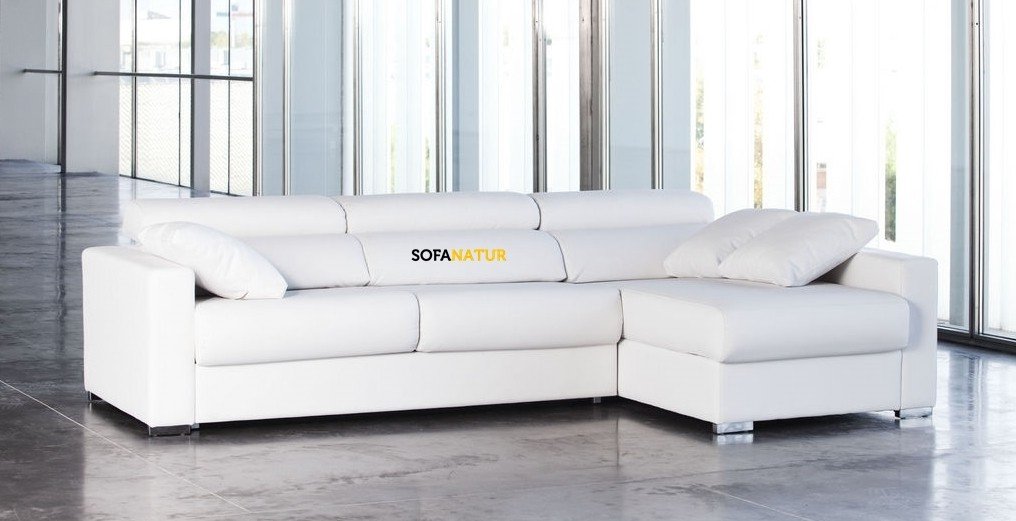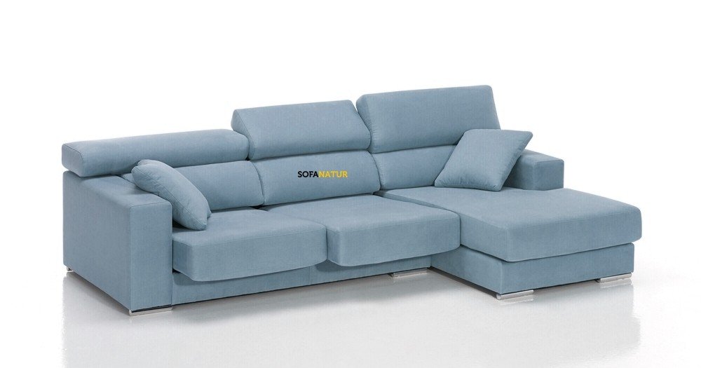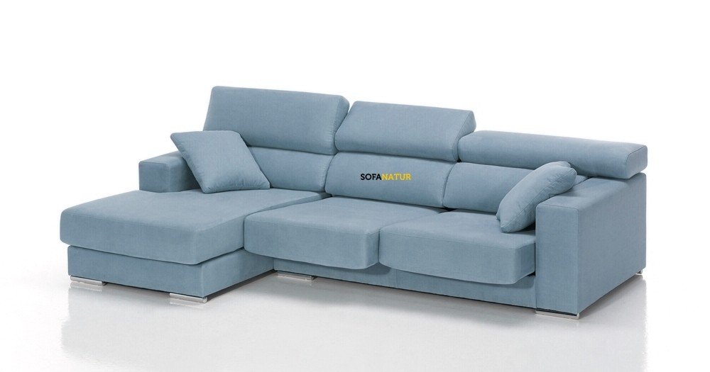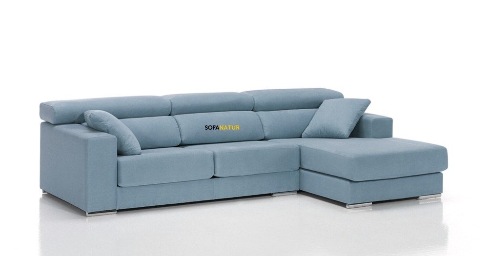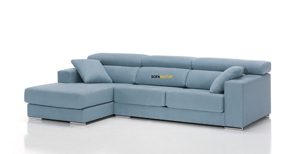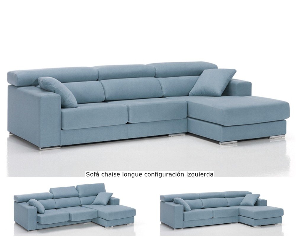 Sofá con 2 asientos extensibles, chaise longue arcón y cabezales abatibles.