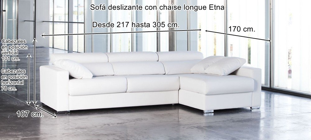 El sofá con asientos deslizantes y chaise longue arcón Etna incorpora cabezales abatibles con varias posiciones para un correcto descanso cervical. El mecanismo abatible del cabezal es visto y acabado en cromo.