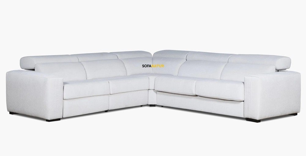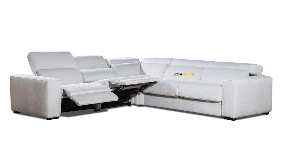 Sofá rinconera con cabezales abatibles, 2 asientos relax motor y brazo siesta arcón.