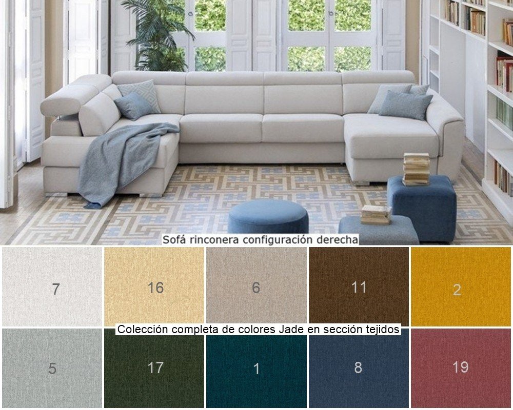 Sofá rinconera en forma de U con cabezales abatibles, módulo rincón chaise longue a un lado, 2 asientos centrales con cama apertura italiana y chaise longue arcón en lado contrario.
