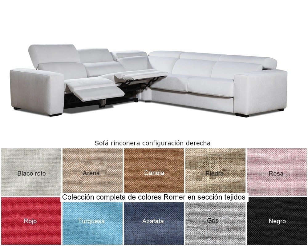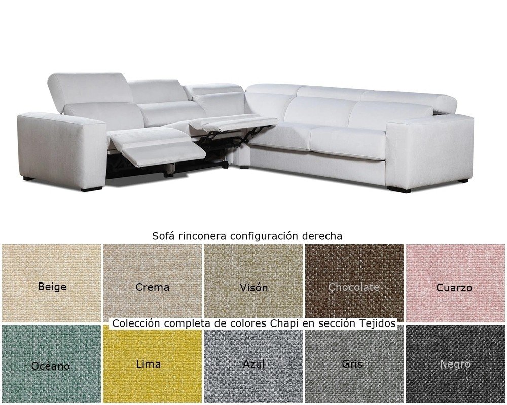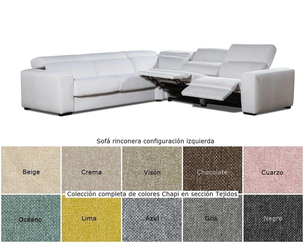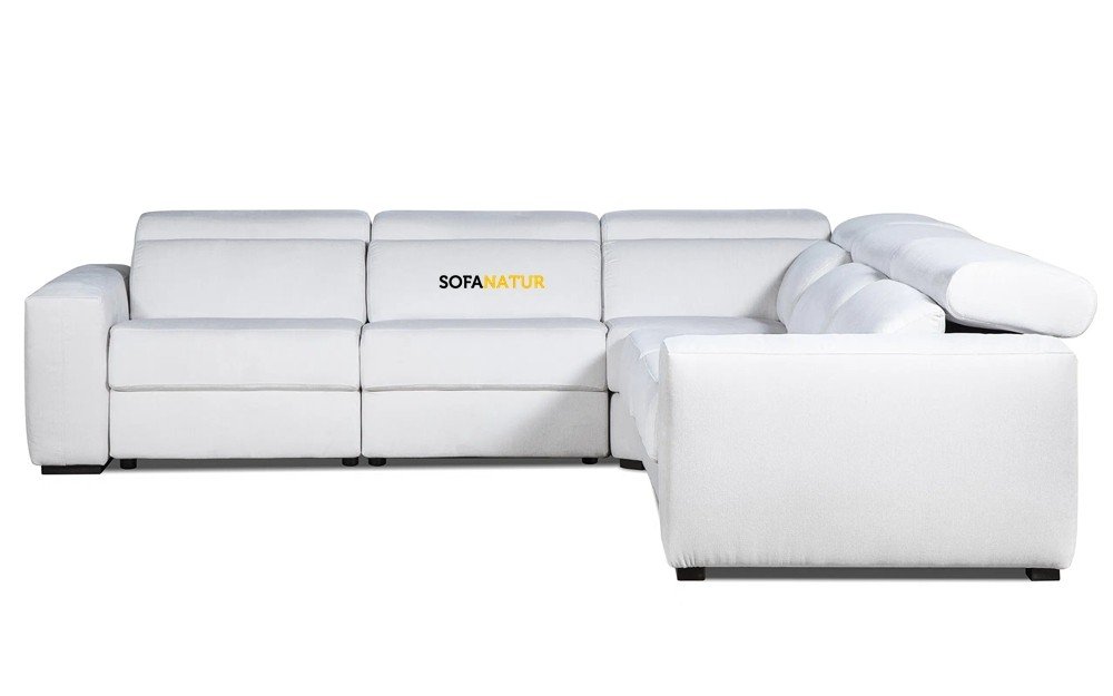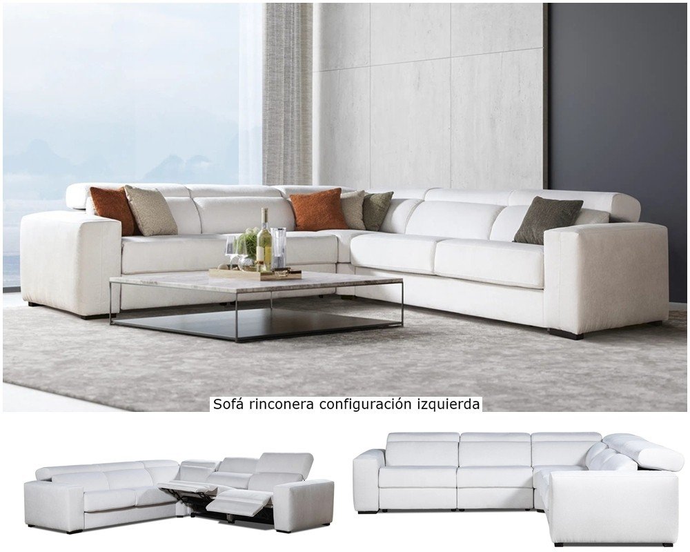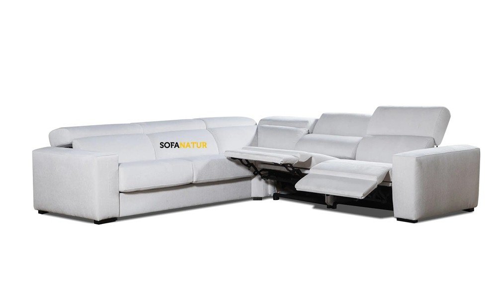 Sofá rinconera con cabezales abatibles, 2 asientos relax motor y brazo siesta arcón.