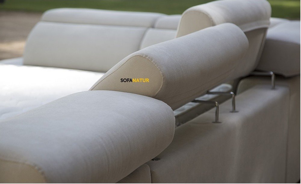 El sofá Etna 3 incorpora cabezales abatibles con un recorrido de 90 grados con varias posiciones para un correcto descanso cervical. El mecanismo abatible del cabezal es visto, metálico y acabado en negro mate.