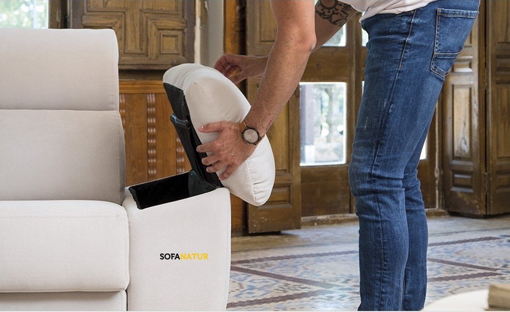 El sofá incorpora de serie brazos rectos ancho 20 cm. con cojín decorativo. Como opción puedes elegir brazo siesta con almohada y arcón ancho 22 cm. al mismo precio.